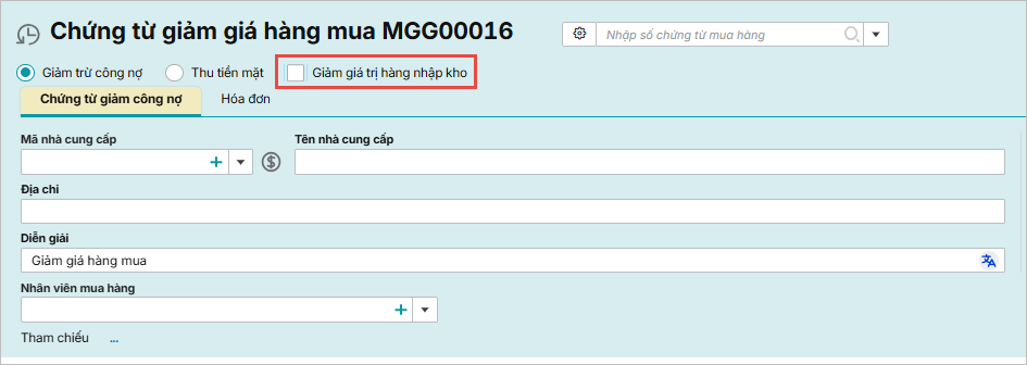 Bước 2: Trên giao diện chi tiết chứng từ giảm giá hàng mua, bỏ tích chọn Giảm giá trị hàng nhập kho