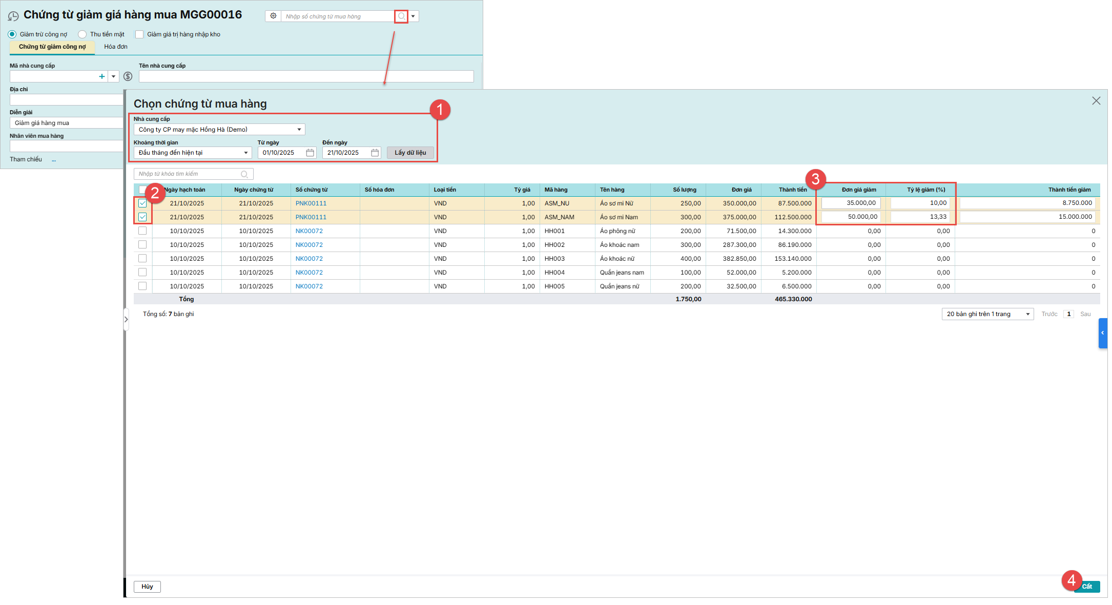 - Chọn nhà cung cấp có phát sinh chứng từ mua hàng