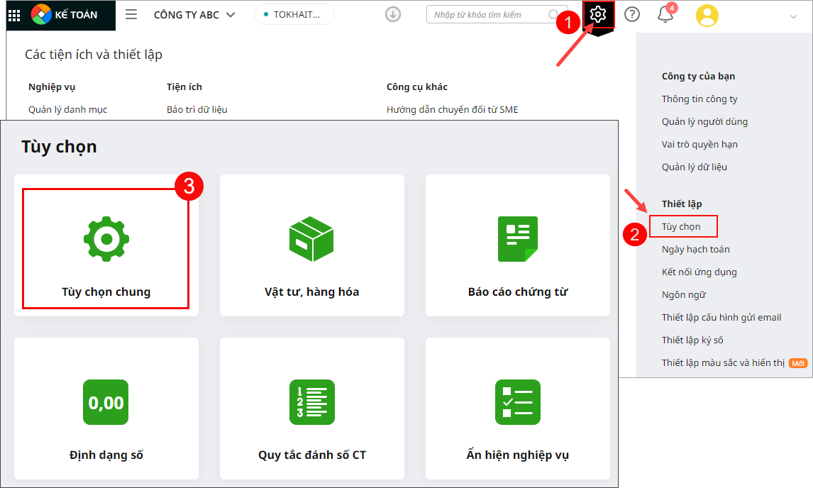 - Thiết lập theo dõi theo ngoại tệ: Nhấn vào biểu tượng Các tiện ích và thiết lập\Tùy chọn\Tùy chọn chung. Tại mục Tiền tệ\ ngay dòng Có phát sinh nghiệp vụ liên quan đến ngoại tệ\ tích chọn vào ô Có và Nhấn Cất.