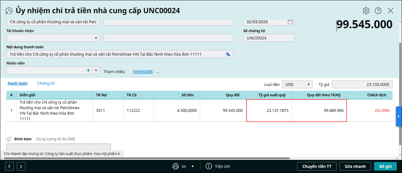 - Tự động xử lý chênh lệch tỷ giá (lãi/lỗ) ngay trên chứng từ chi.