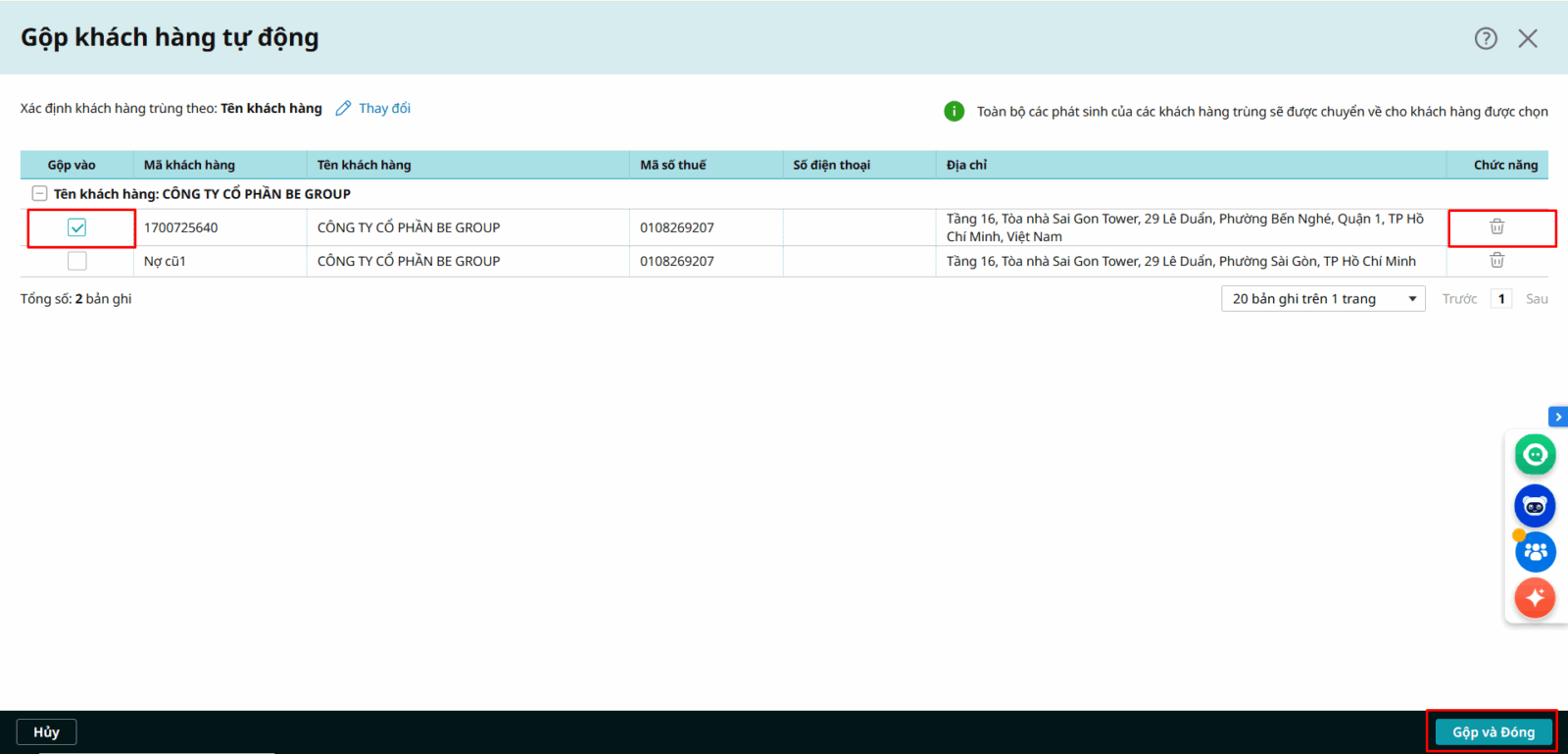 Bước 3: Tích chọn 1 khách hàng sẽ được gộp vào, chương trình sẽ tự động xóa các khách hàng còn lại sau khi gộp và chuyển toàn bộ các phát sinh về cho khách hàng được chọn.