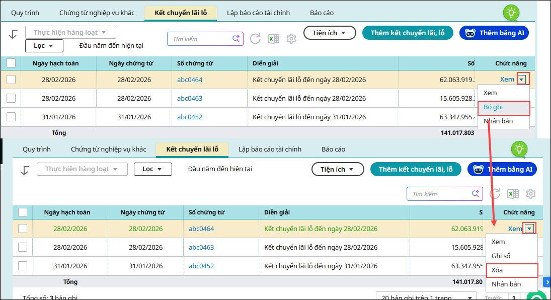 3. Cách sửa, xóa chứng kết chuyển lãi lỗ