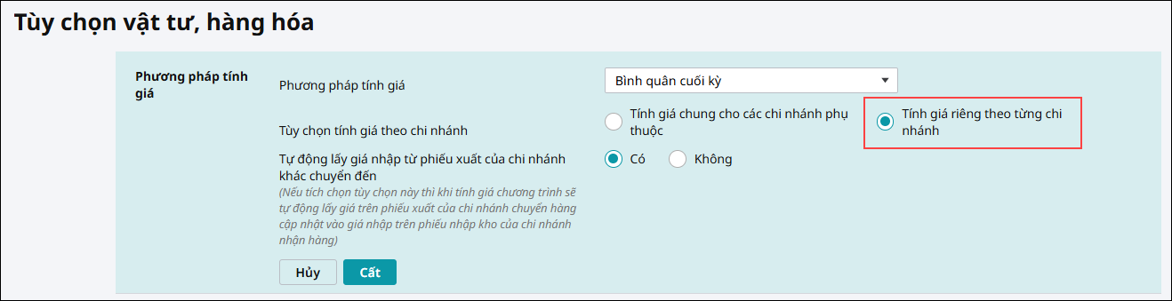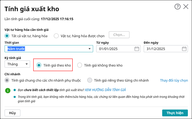 Lưu ý: Để kiểm tra phương pháp tính giá xuất kho đơn vị đang áp dụng, vào Các tiện ích và thiết lập\Tuỳ chọn\Vật tư hàng hoá, xem mục Phương pháp tính giá.