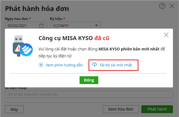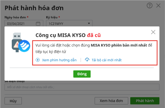 Trong trường hợp người dùng thực hiện phát hành hóa đơn điện tử bằng USB Token nhưng MISA KYSO chưa cập nhật phiên bản mới nhất thì khi phát hành hóa đơn, chương trình sẽ hiển thị cảnh báo: Công cụ MISA KYSO đã cũ, người dùng cần cài đặt hoặc chọn đúng MISA KYSO phiên bản mới nhất để tiếp tục thực hiện ký điện tử: