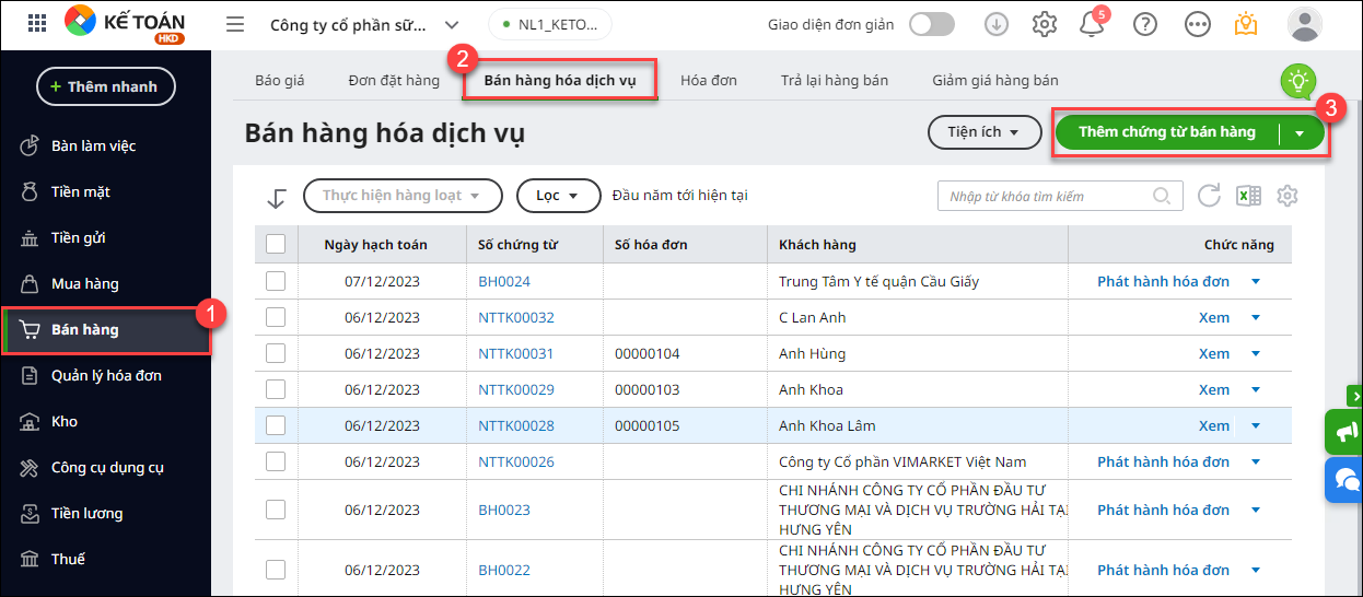 Bước 1: Vào phân hệ Bán hàng, chọn tab Bán hàng hóa dịch vụ và nhấn Thêm chứng từ bán hàng.