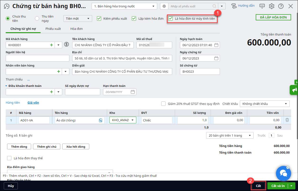 Bước 2: Khai báo chứng từ bán hàng và tích chọn Là hóa đơn từ máy tính tiền. Sau đó nhấn Cất.