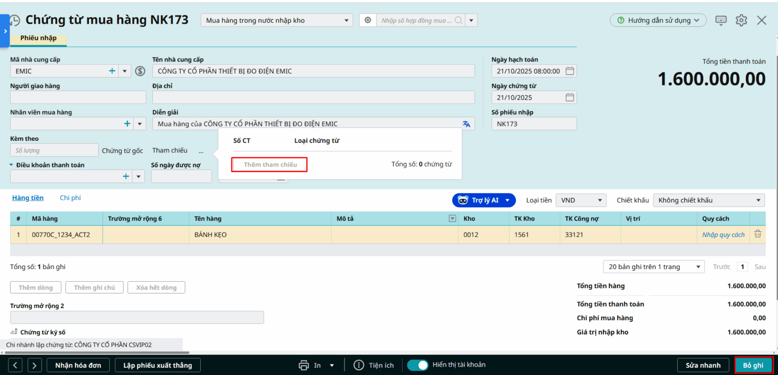 - Đồng thời xoá bỏ chứng từ tham chiếu trong trường hợp chọn sai: