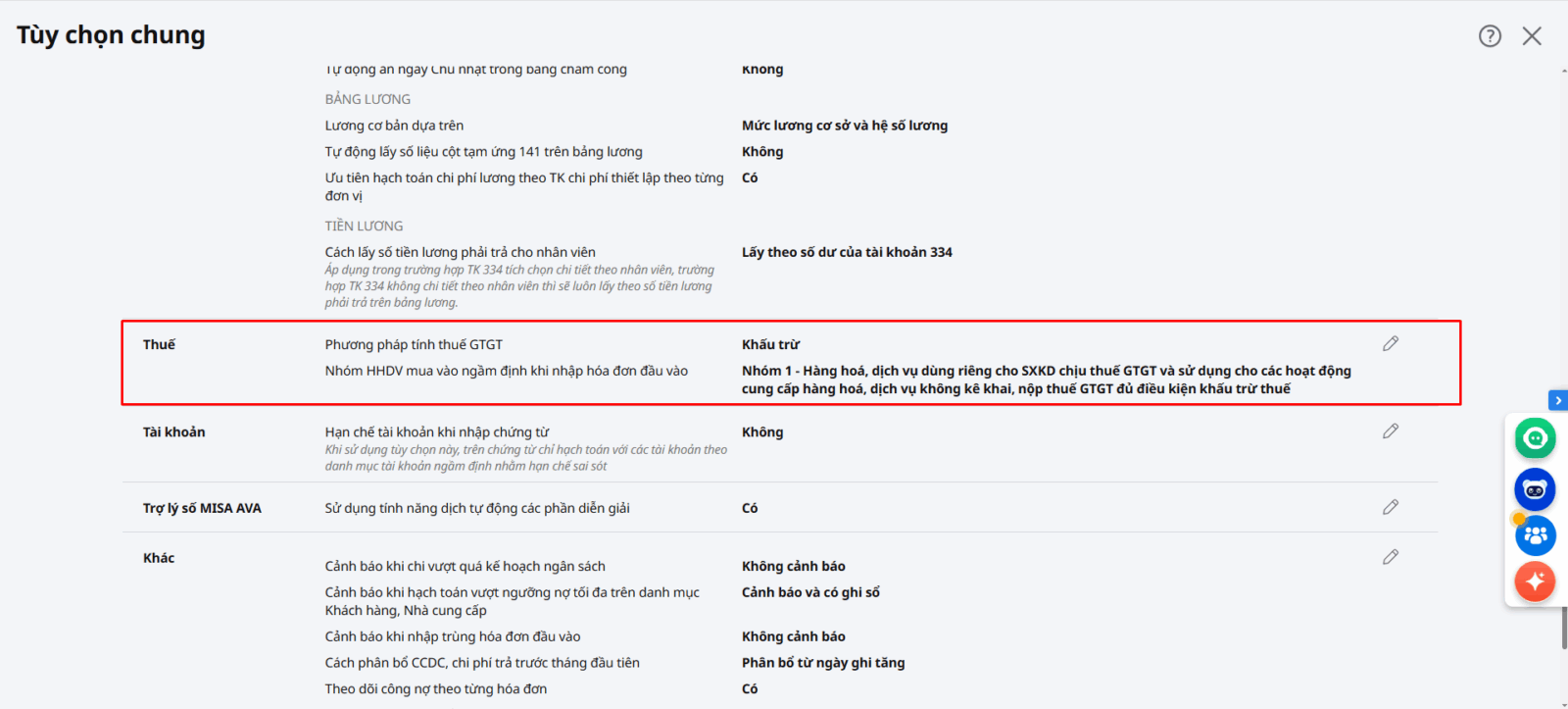 Bước 3: Tại mục Thuế, kiểm tra thông tin về phương pháp tính thuế GTGT