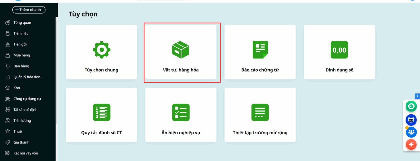 Bước 4: Vào Các tiện ích và thiết lập\Tùy chọn\ Vật tư hàng hóa