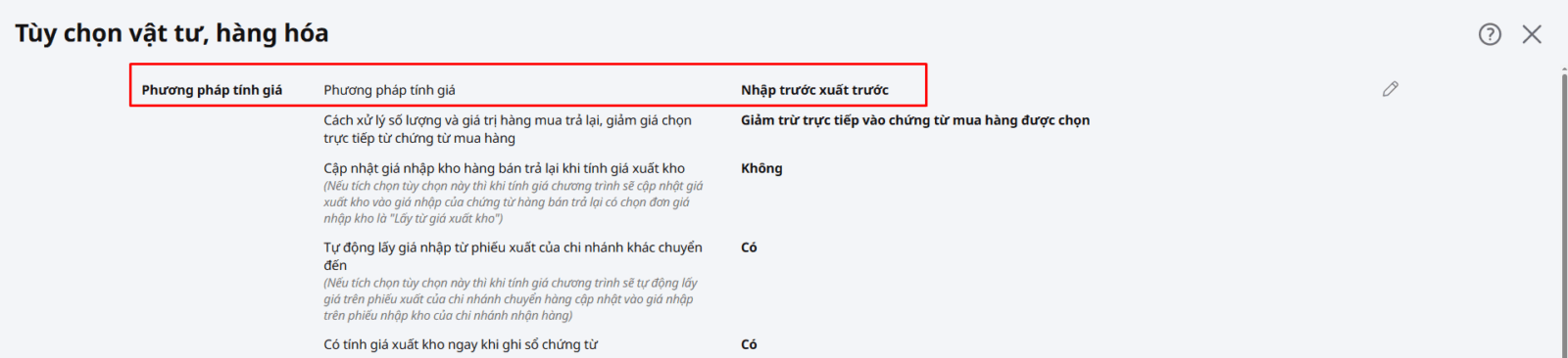 Bước 5: Kiểm tra thông tin về phương pháp tính giá xuất kho