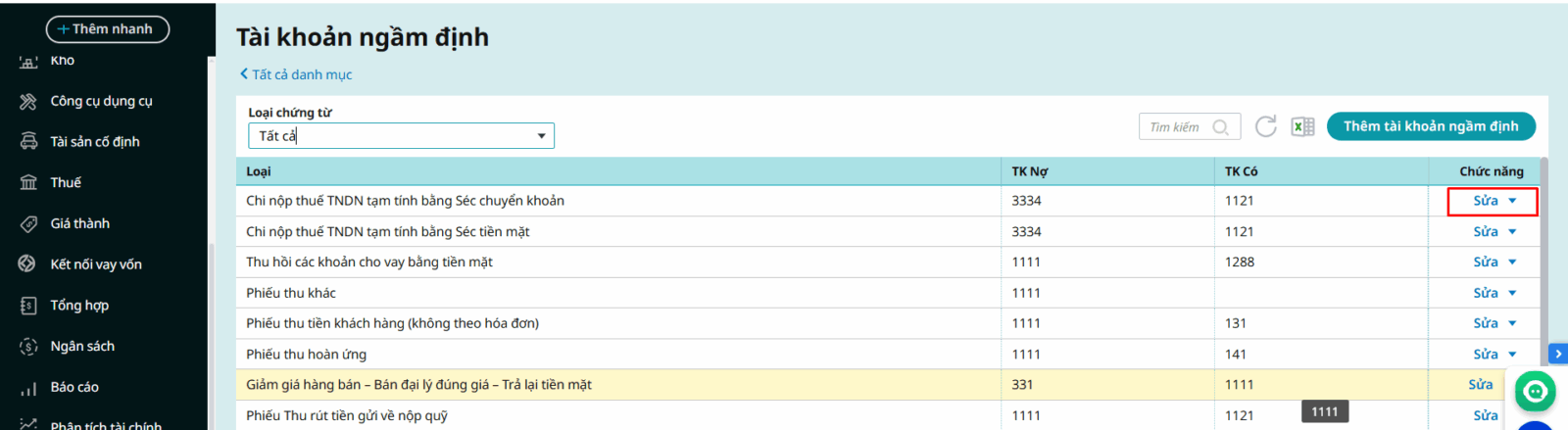 Bước 2: Tại màn hình danh sách tài khoản ngầm định, chọn một loại chứng từ sau đó chọn chức năng Sửa ở cột Chức năng