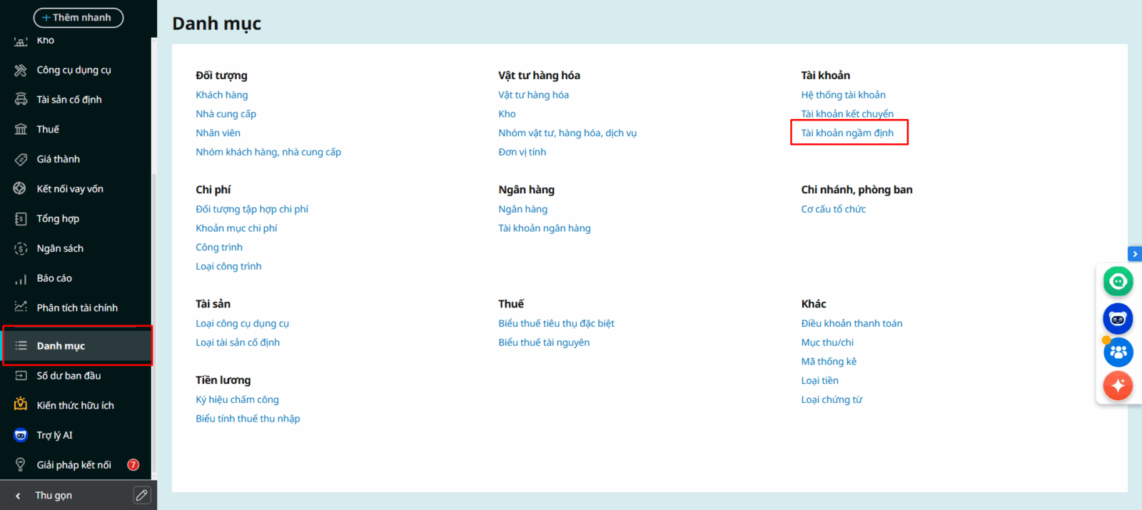 Bước 1: Vào Danh mục\Tài khoản ngầm định