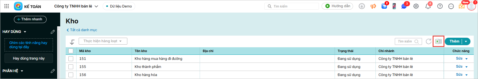 Bước 2: Tại màn hình danh sách kho, chọn chức năng Thêm trên thanh công cụ. Bước 3: Khai báo các thông tin về kho => với các thông tin có ký hiệu (*) Anh/Chị sẽ bắt buộc phải khai báo. Bước 4: Nhấn Cất. Xem hướng dẫn chi tiết tại đây. 2.2. Xuất ra Excel danh sách khoCác bước thực hiện như sau: Bước 1: Vào Các tiện ích và thiết lập\Quản lý danh mục\Vật tư hàng hoá\Kho. Bước 2: Trên danh sách kho, nhấn biểu tượng Excel chức năng Xuất ra Excel để xuất khẩu danh mục