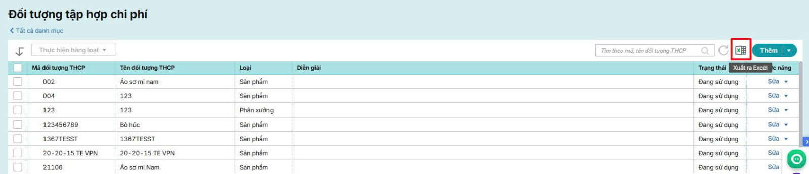 Bước 3: (Nếu cần) Xuất danh sách Đối tượng tập hợp chi phí ra Excel bằng cách nhấn Xuất ra Excel.