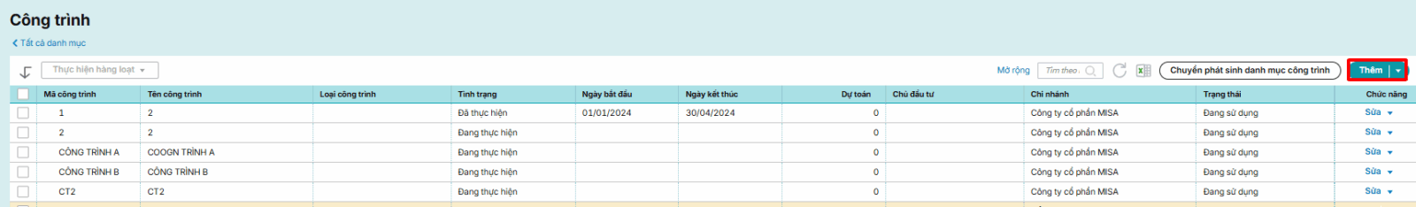 Bước 2: Tại màn hình danh sách công trình, chọn chức năng Thêm.