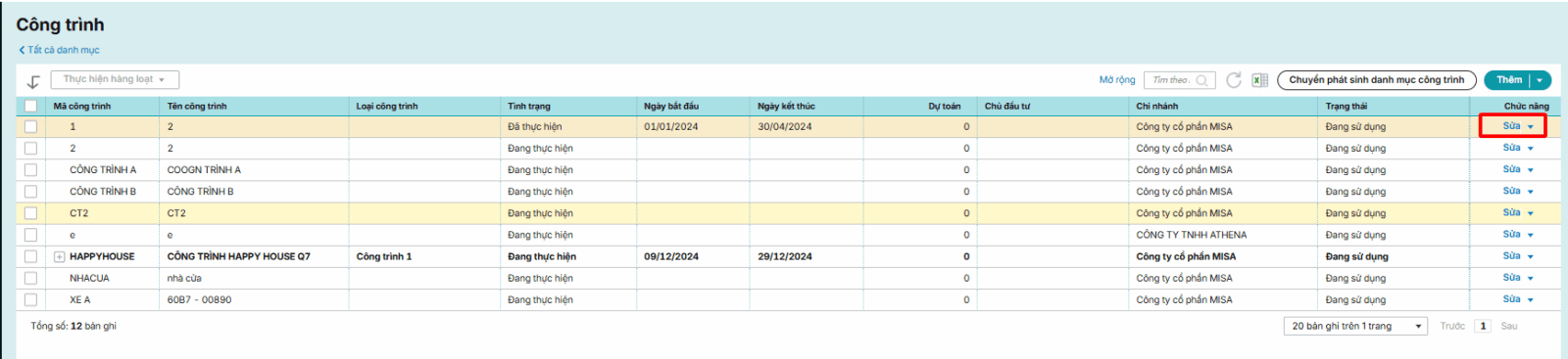 Để sửa lại thông tin công trình đã khai báo, trên giao diện danh sách nhấn mũi tên tại cột Chức năng → chọn Sửa.