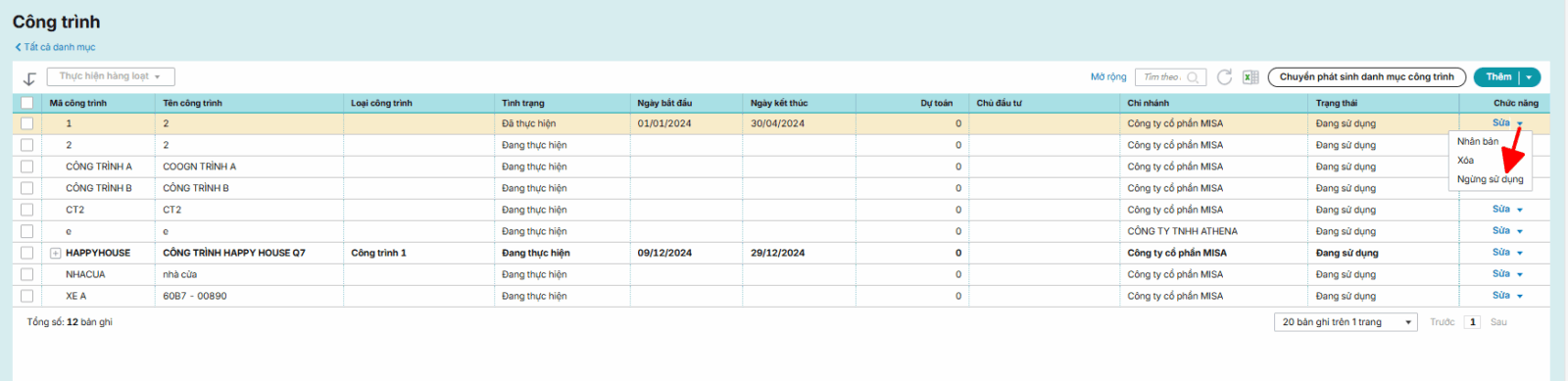 Đối với công trình không còn nhu cầu sử dụng, trên giao diện danh sách nhấn mũi tên tại cột Chức năng → chọn Ngừng sử dụng.