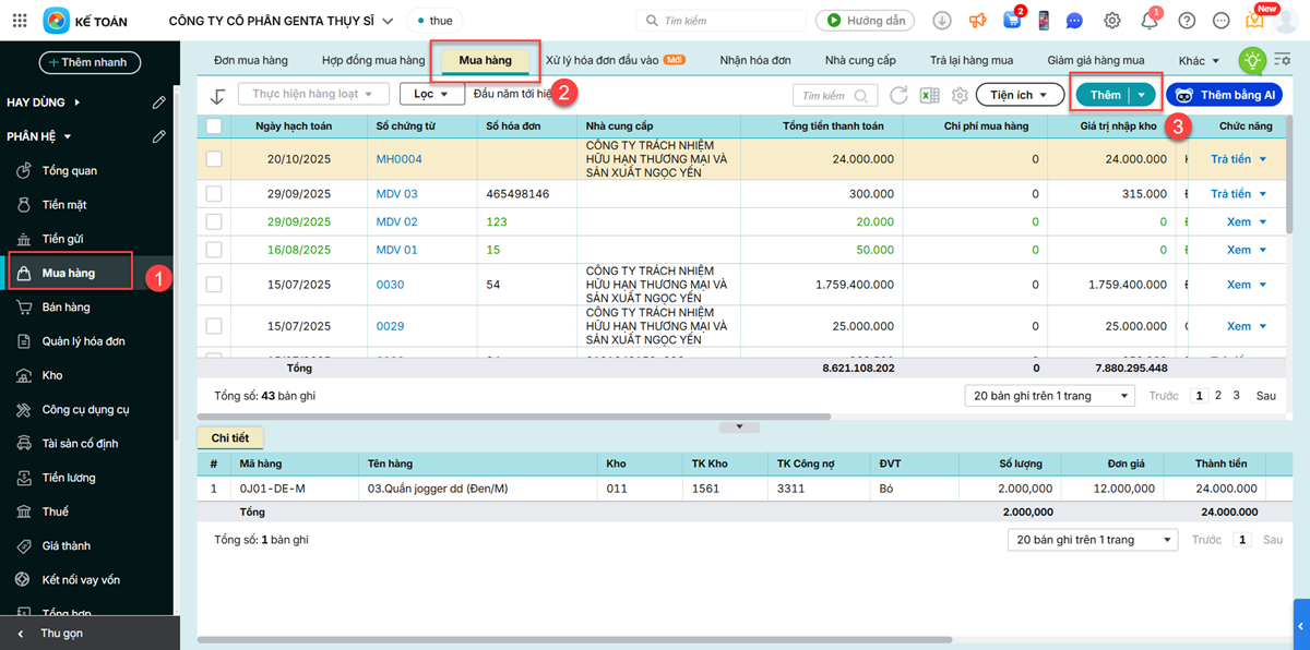 Bước 1: Trên phân hệ Mua hàng\tab Mua hàng , chọn chức năng Thêm\Chứng từ mua hàng.
