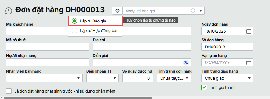 Bước 2: Tại giao diện Đơn đặt hàng, nhấn biểu tượng ⚙ Tùy chọn lập chứng từ. Chọn Lập từ báo giá.