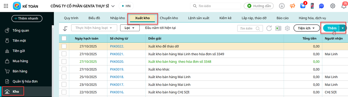 Bước 1: Vào phân hệ Kho\ tab Xuất kho\ nhấn Thêm
