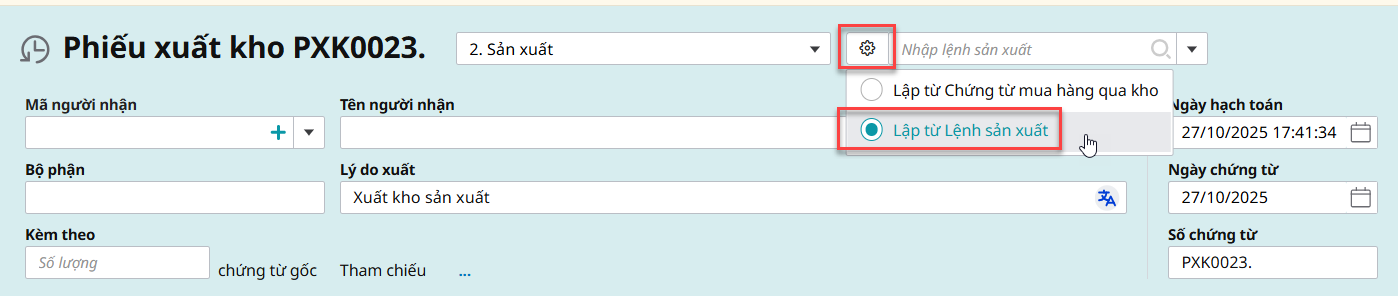 Bước 3: Nhấn biểu tượng bánh răng cưa ⚙ tích chọn Lập từ lệnh sản xuất