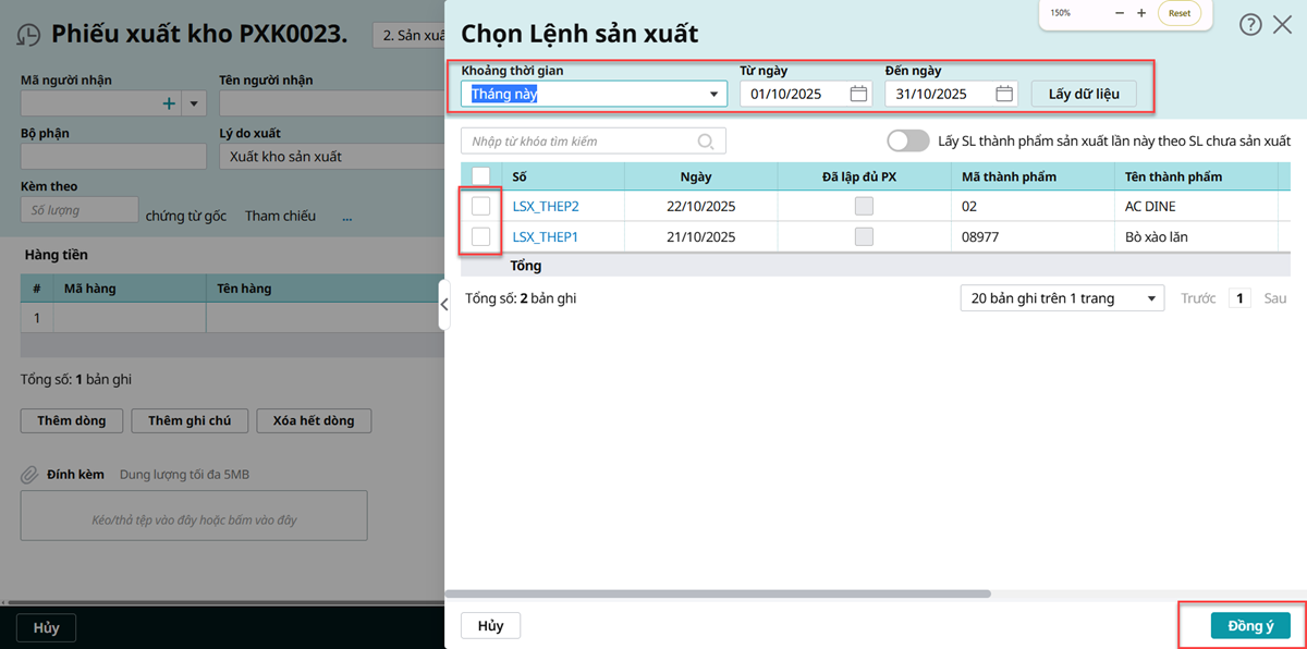 Cách 1: Nhấn biểu tượng mũi tên ⏷và tích chọn Lệnh sản xuất cần lập, hệ thống sẽ tự động lấy nguyên vật liệu và số lượng của từng NVL tương ứng với số lương thành phẩm sản xuất theo định mức NVL trên lệnh sản xuất.