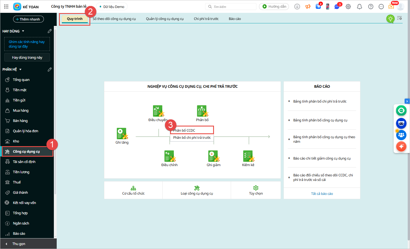 - Bước 1: Vào phân hệ Công cụ dụng cụ\Quy trình, chọn chức năng Phân bổ chi phí CCDC.
