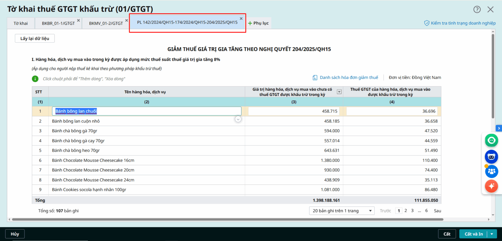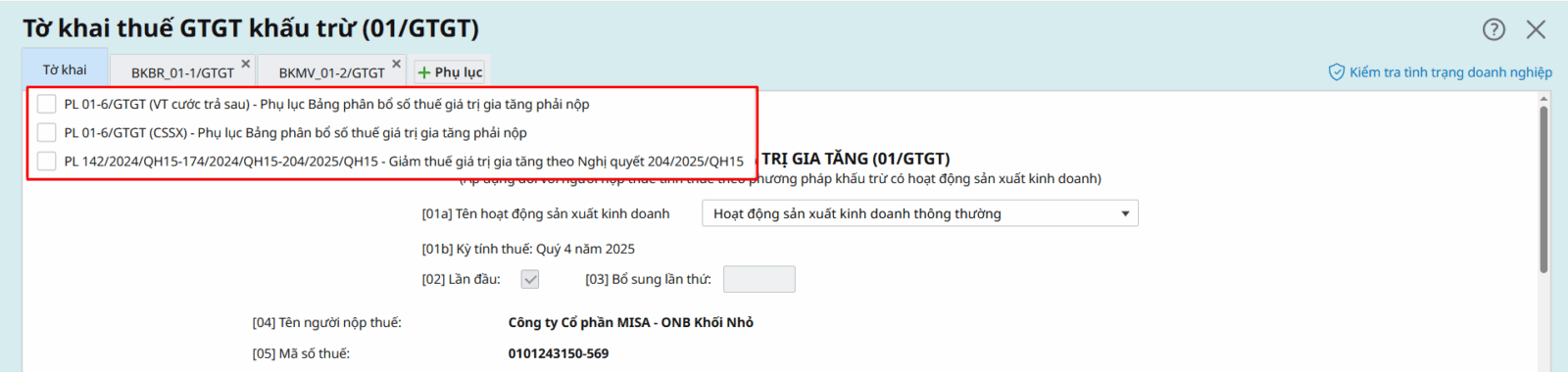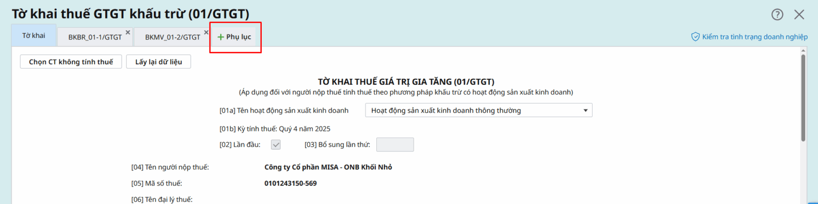 - Chương trình sẽ tự động thêm phụ lục được tích chọn vào tờ khai đang lập: