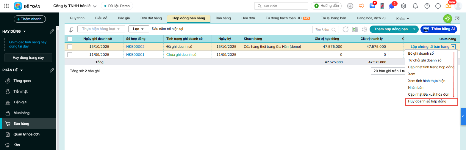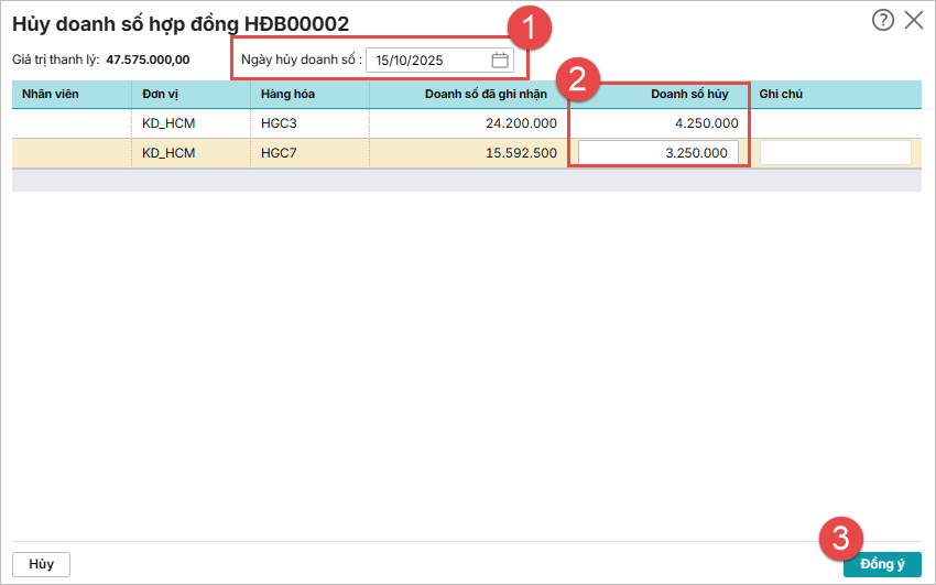 Phạm vi đáp ứng: Tính năng hủy doanh số hợp đồng bán chỉ áp dụng cho các hợp đồng bán đã được ghi nhận doanh số.