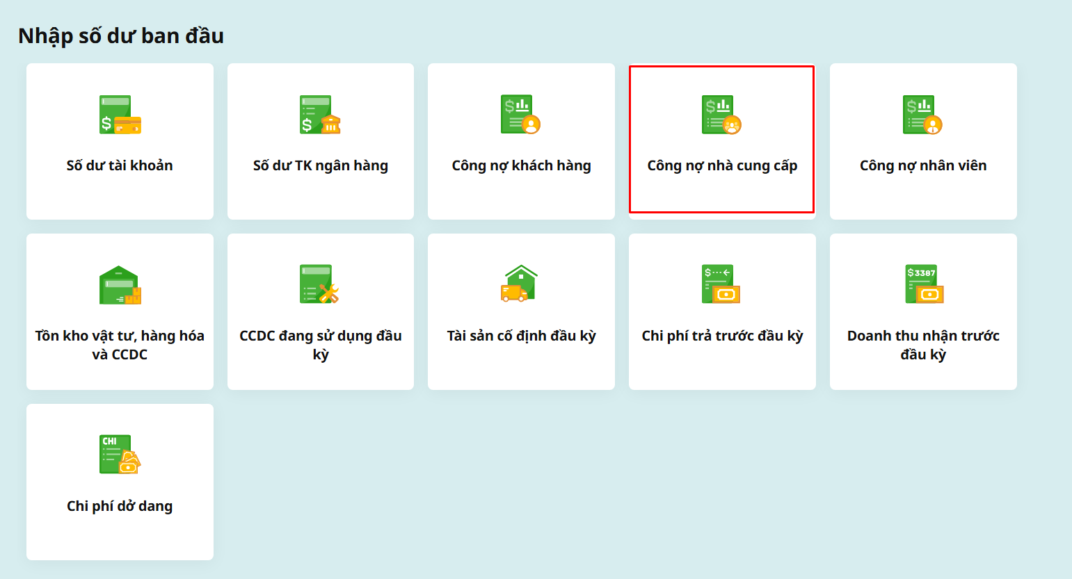 Anh chị có thể nhập số dư đầu kỳ công nợ nhà cung cấp bằng một trong hai cách sau: