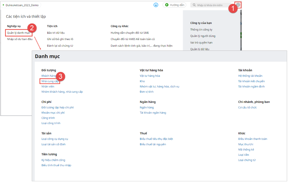 Bước 1: Vào biểu tượng bánh răng ⚙️ Các tiện ích và thiết lập\Quản lý danh mục\Đối tượng\Nhà cung cấp.