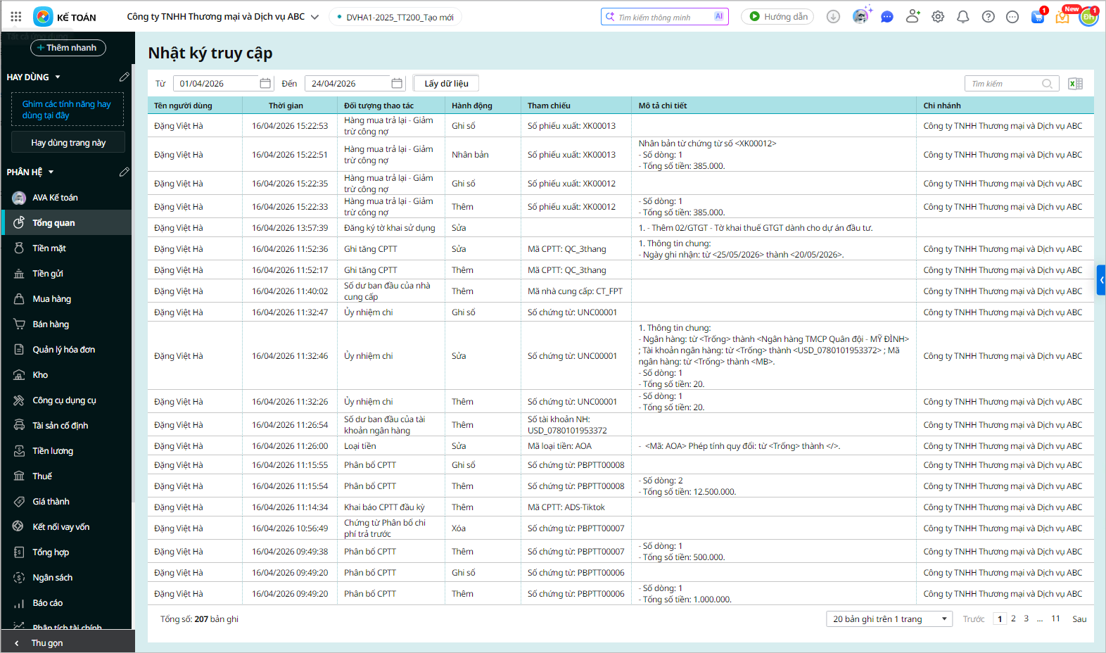 - Mô tả chi tiết: liệt kê chi tiết các nội dung bị thay đổi. (Lưu ý: Đối với hành động Xóa chứng từ hệ thống sẽ không lưu lại mô tả chi tiết nội dung của chứng từ đã xóa)