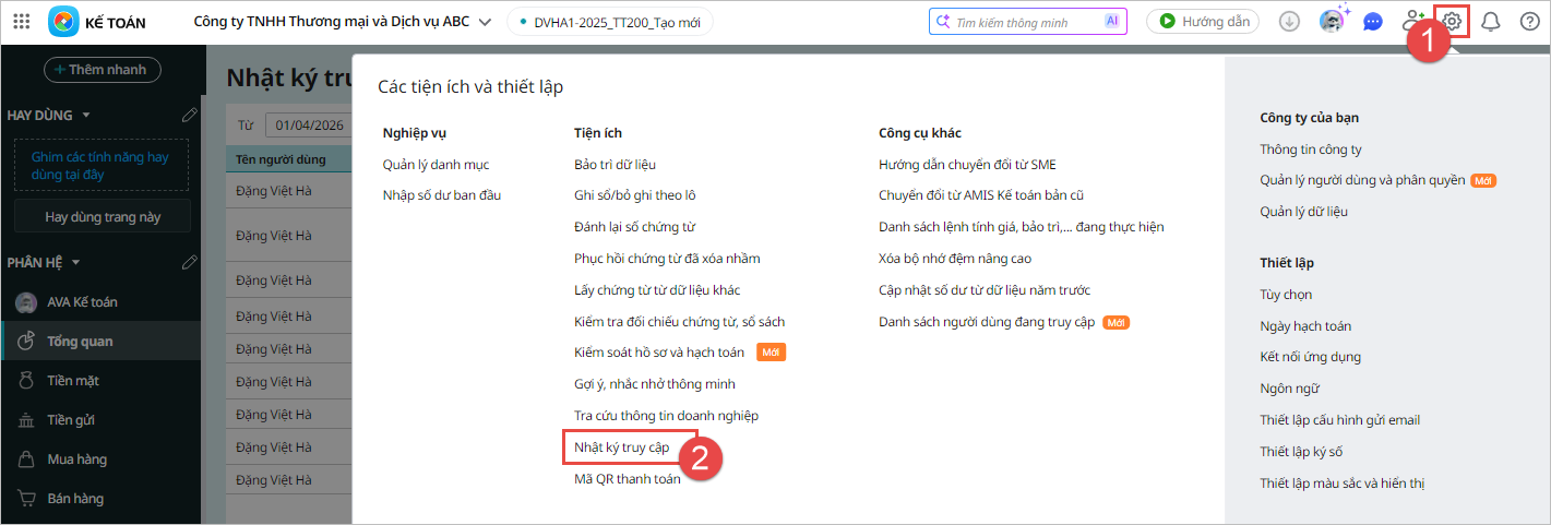 Bước 1: Vào Các tiện ích và thiết lập, chọn Nhật ký truy cập: