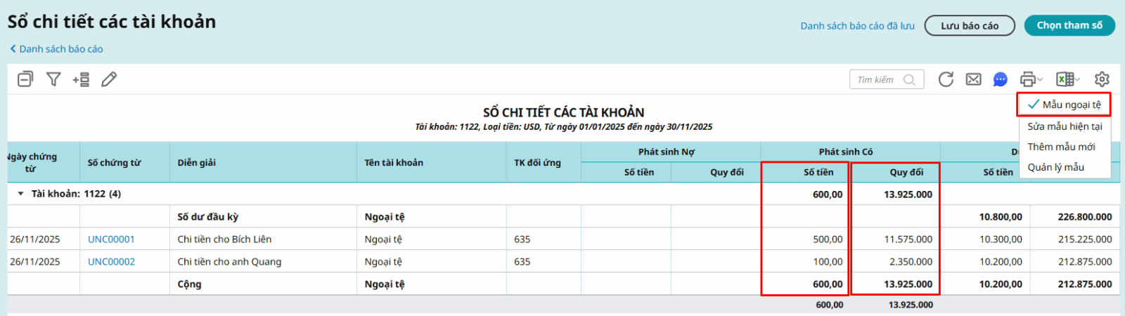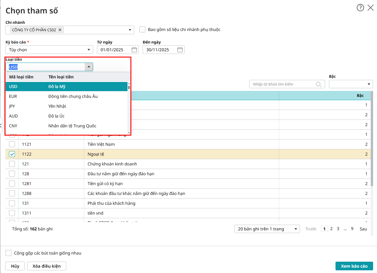 - Trường hợp xem Sổ chi tiết các tài khoản theo ngoại tệ, tại bước 2 thiết lập tham số báo cáo Chọn Loại tiền cần xem: