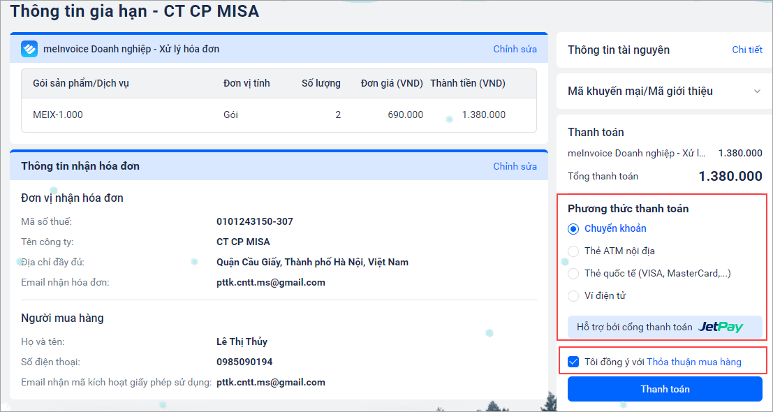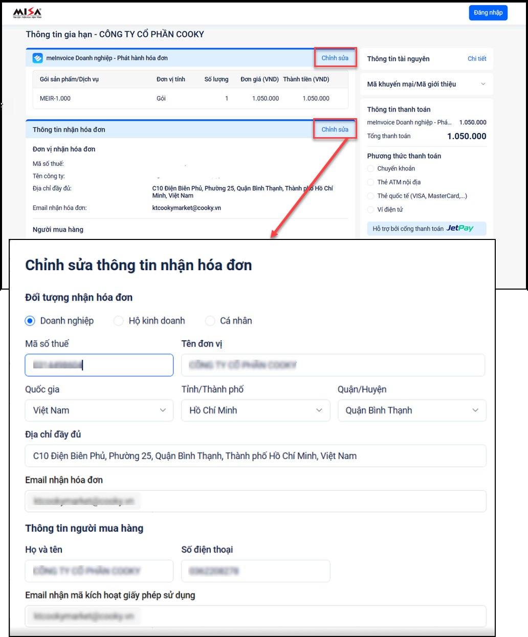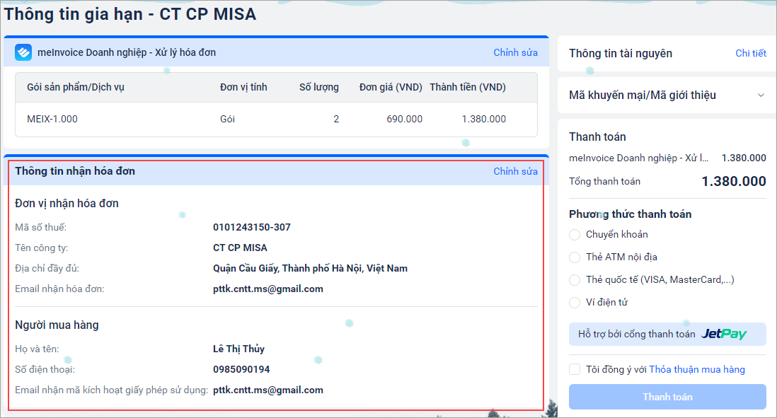 Sau khi thanh toán thành công, MISA sẽ gửi hóa đơn mua tài nguyên cho đơn vị qua email tại mục Email nhận hóa đơn.