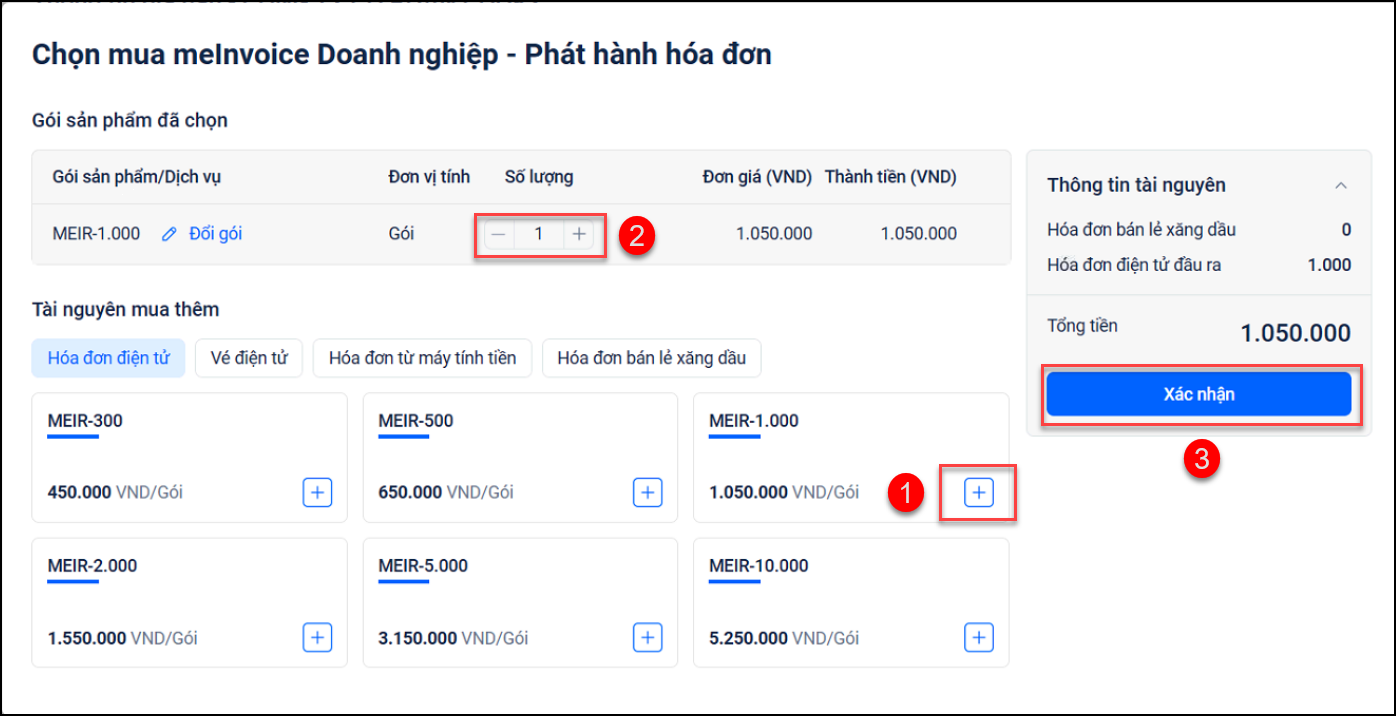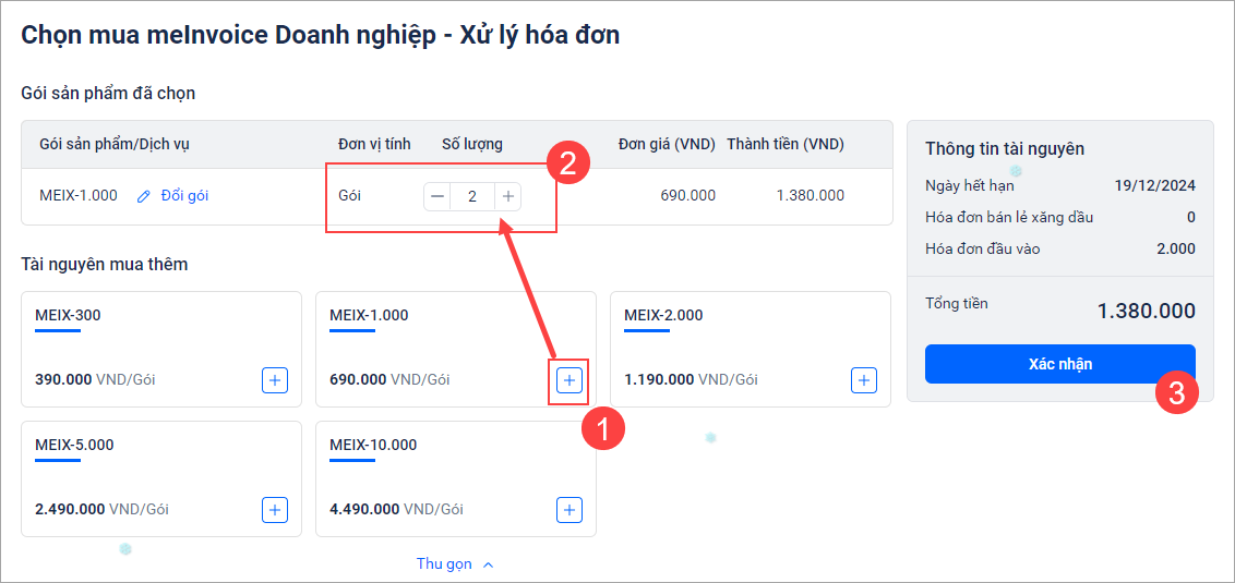 - Bước 3: Chọn gói tài nguyên mua thêm, khai báo số gói tài nguyên mua thêm, nhấn Xác nhận.