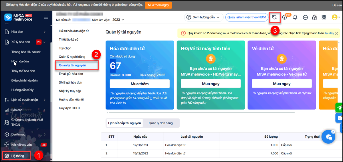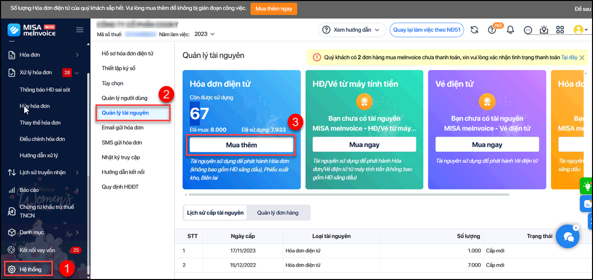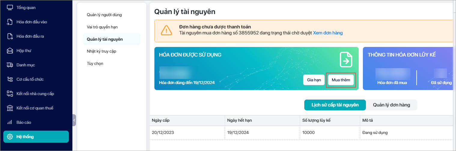 - Bước 2: Vào mục Hệ thống > Quản lý tài nguyên, tại loại hóa đơn điện tử cần mua, nhấn Mua thêm.