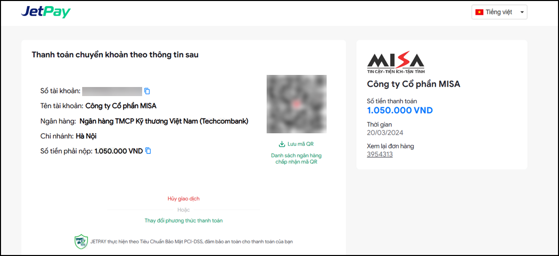 - Bước 7: Thực hiện thanh toán theo thông tin đơn hàng hoặc quét QR code chuyển khoản trực tiếp.