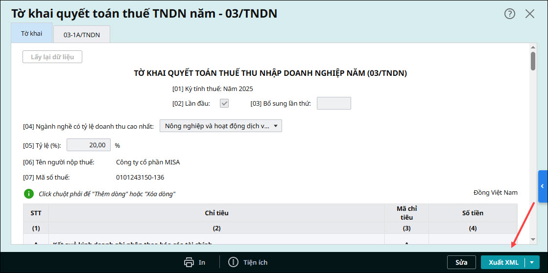 Bước 1: Xuất hồ sơ quyết toán và đăng nhập MTAX– Xuất tờ khai 03/TNDN – Tờ khai quyết toán thuế TNDN: Vào phân hệ Thuế \ Khai thuế, mở tờ khai đã lập và nhấn Xuất XML.