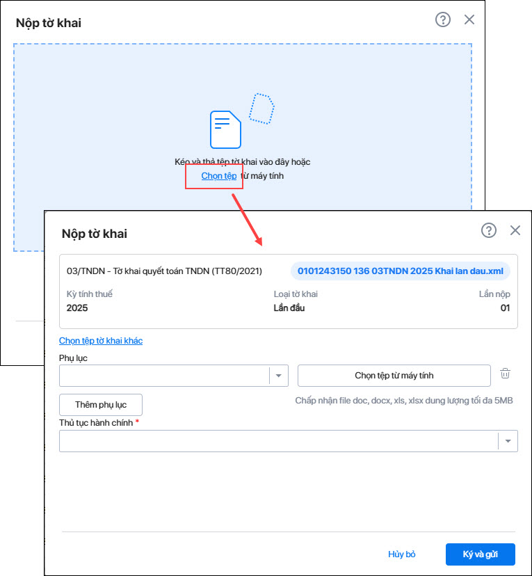 Bước 4: Trên giao diện Gửi phụ lục, nhấn mũi tên chọn loại phụ lục cần gửi (ví dụ: Thuyết minh báo cáo tài chính) và nhấn chọn tệp từ máy tính để chọn đến file phụ lục cần gửi -> nhấn Ký và gửi