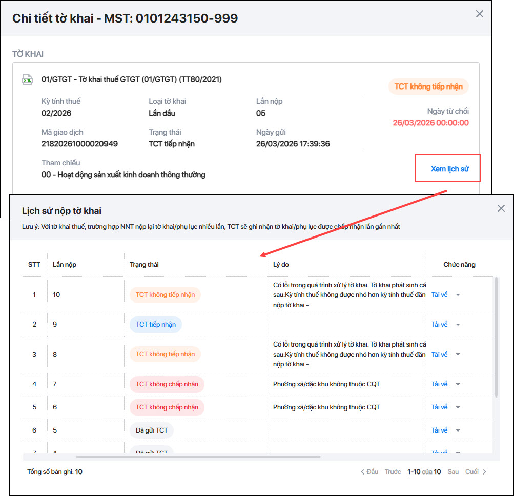 - Trường hợp tờ khai có trạng thái TCT không tiếp nhận hoặc TCT không chấp nhận. Anh/chị có thể xem lý do CQT từ chối tại cột Thông báo trên danh sách tờ khai.