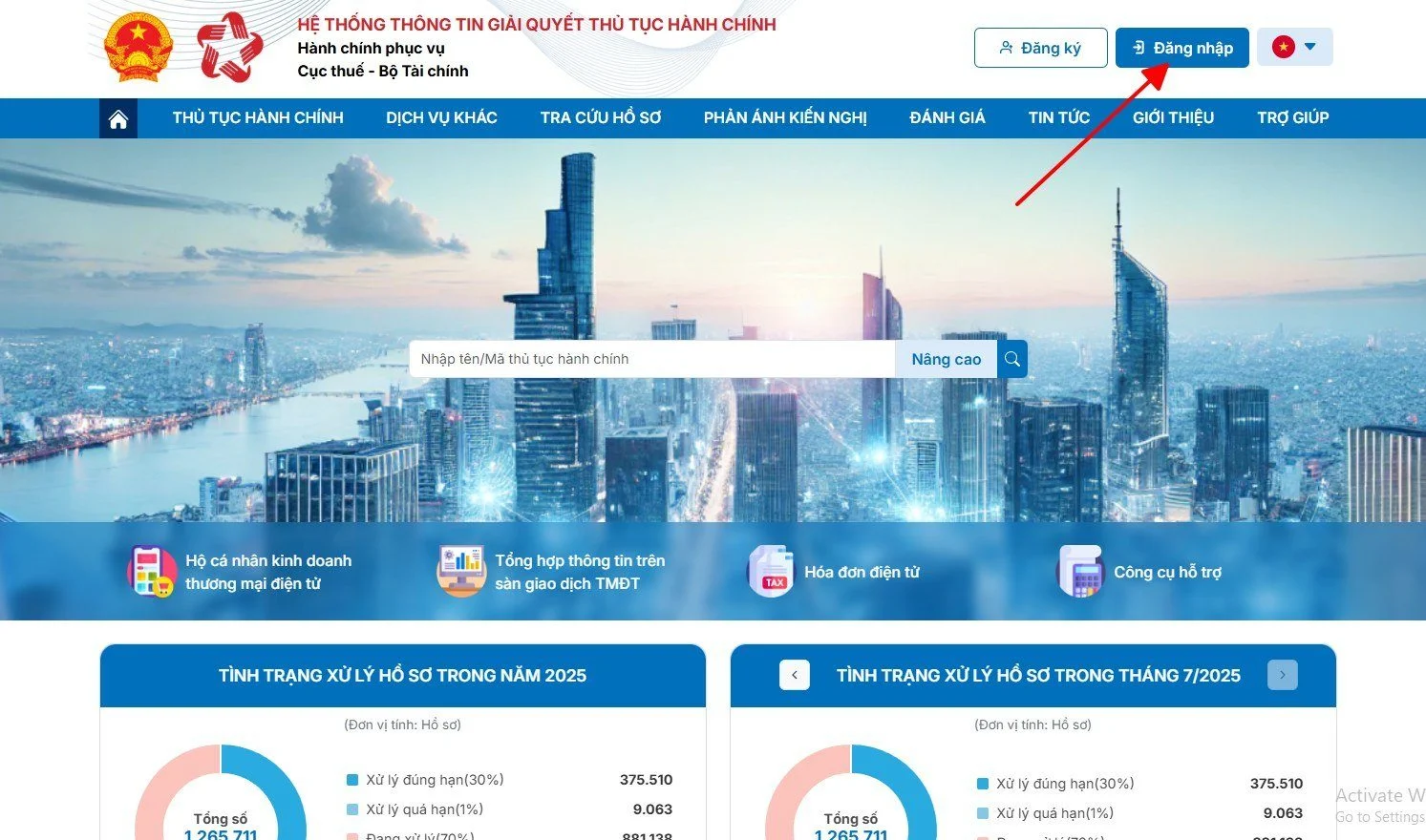 - Bấm vào “Đăng nhập” để đăng nhập vào Hệ thống thông tin giải quyết thủ tục hành chính