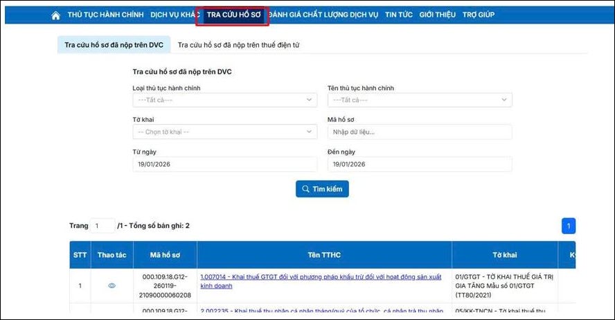 - Để kiểm tra trạng thái tờ khai đã nộp, anh/chị vào mục TRA CỨU HỒ SƠ, tab Tra cứu hồ sơ đã nộp trên dịch vụ công