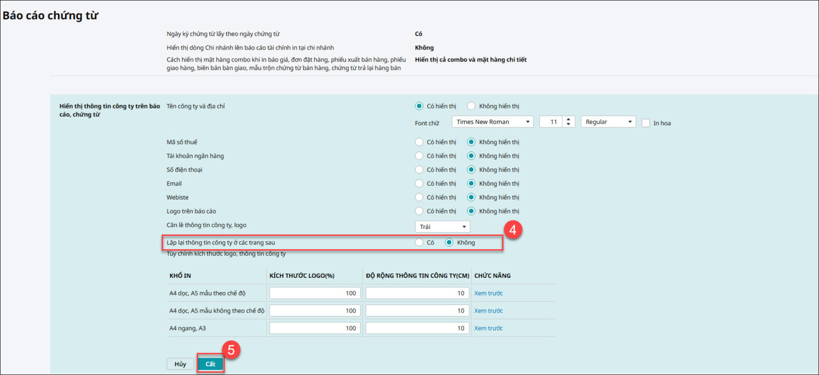 Bước 2: Thiết lập hiển thị lên báo cáo, chứng từ