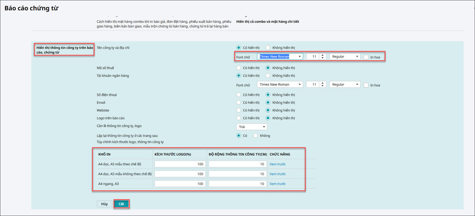 Bước 2: Thiết lập hiển thị lên báo cáo, chứng từ