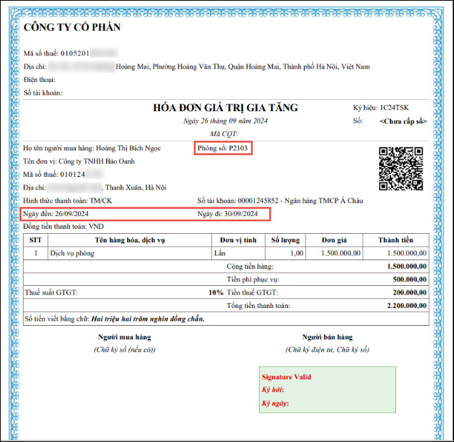 - Hóa đơn dịch vụ lưu trú: Thể hiện chi phí thuê phòng của khách, là loại hóa đơn cơ bản nhất.