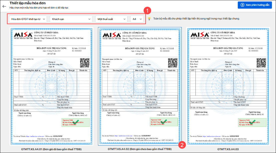 - Hóa đơn khách sạn đã bao gồm thuế tiêu thụ đặc biệt: Dành cho các dịch vụ lưu trú chịu thuế tiêu thụ đặc biệt, đơn giá đã bao gồm thuế. Xem hướng dẫn Tại đây