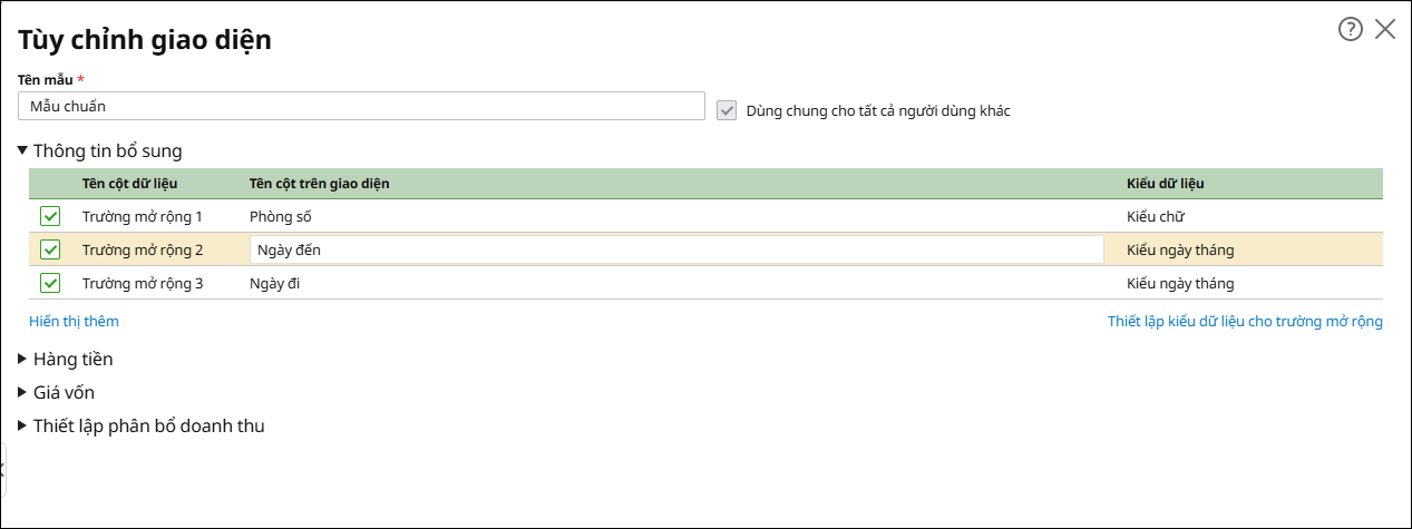- Trường mở rộng 1: tương ứng Phòng số trên hóa đơn