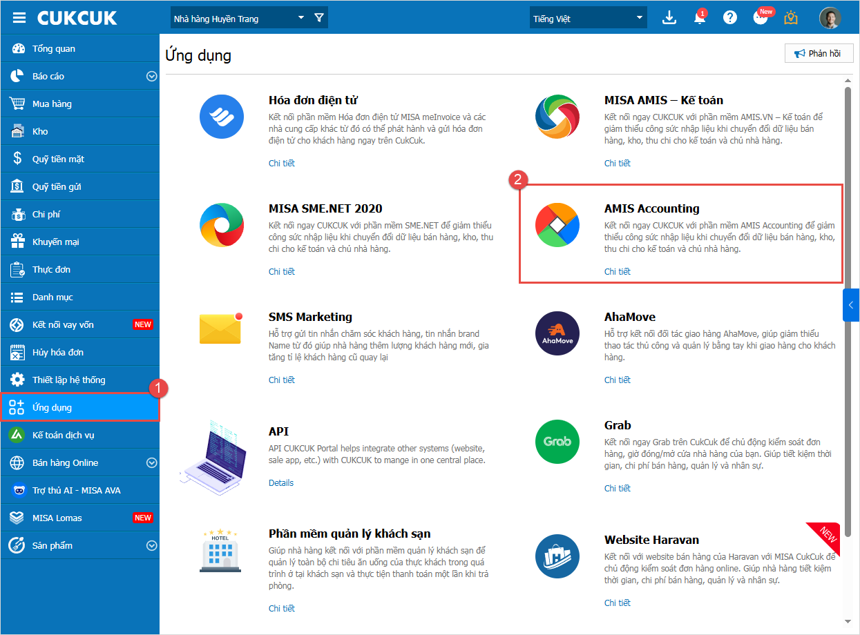 2.2. Thực hiện kết nối dữ liệu kế toán với phần mềm CukcukBước 1: Vào Các tiện ích và thiết lập, chọn Kết nối ứng dụng: