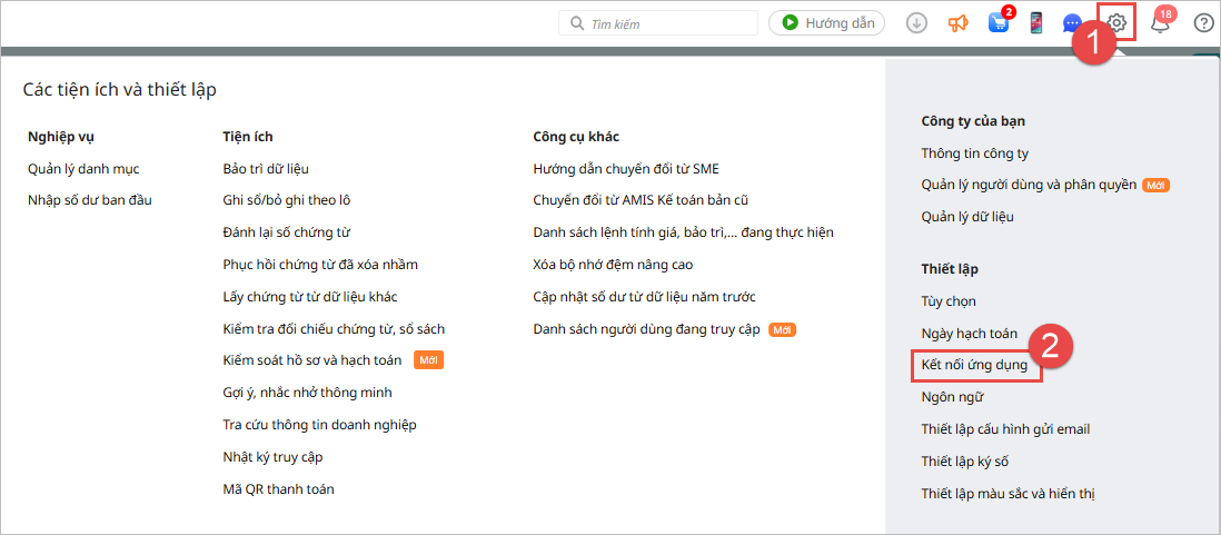2.1. Kết nối dữ liệu kế toán với MISA eShopBước 1: Vào chức năng Các tiện ích và thiết lập, chọn Kết nối ứng dụng: